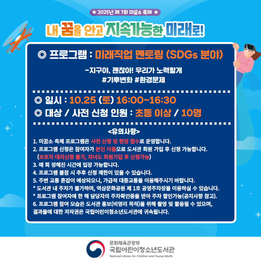 6. 프로그램 참여 모습은 도서관 홍보(비영리 목적)을 위해 촬영 및 활용될 수 있으며, 결과물에 대한 저작권은 국립어린이청소년도서관에 귀속됩니다.