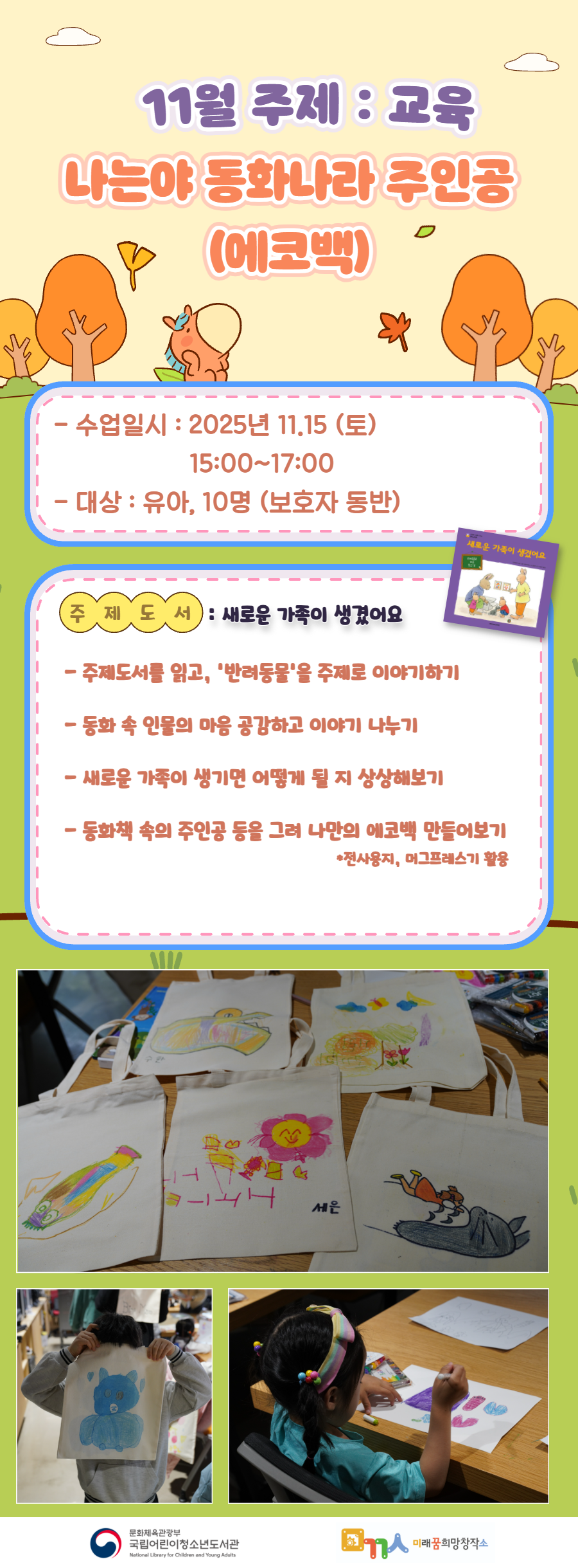 10. 프로그램 참여 모습은 도서관 홍보(비영리목적)를 위해 촬영 및 활용 될 수 있으며, 결과물에 대한 저작권은 국립어린이청소년도서관에 귀속됩니다.
