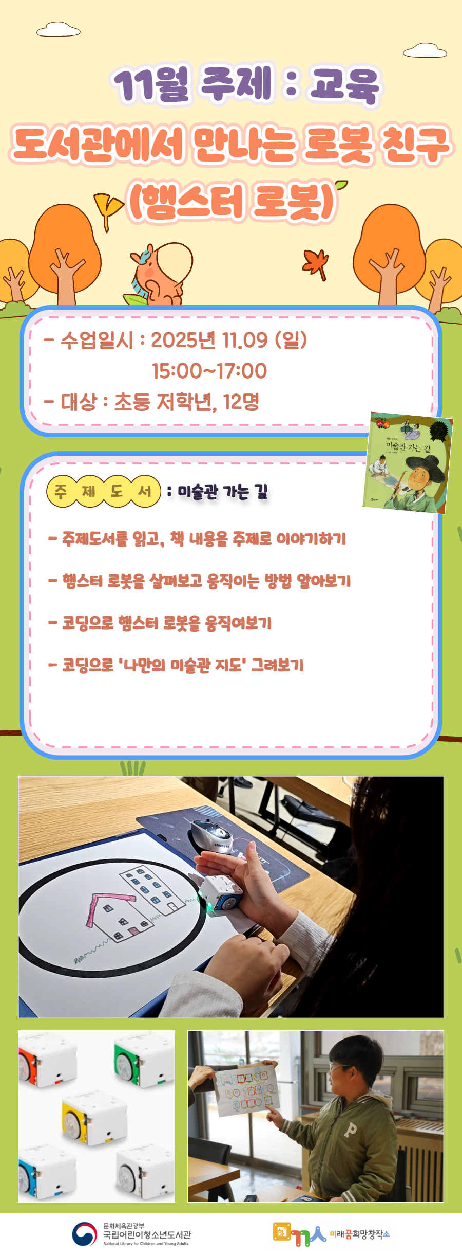 10. 프로그램 참여 모습은 도서관 홍보(비영리목적)를 위해 촬영 및 활용 될 수 있으며, 결과물에 대한 저작권은 국립어린이청소년도서관에 귀속됩니다.