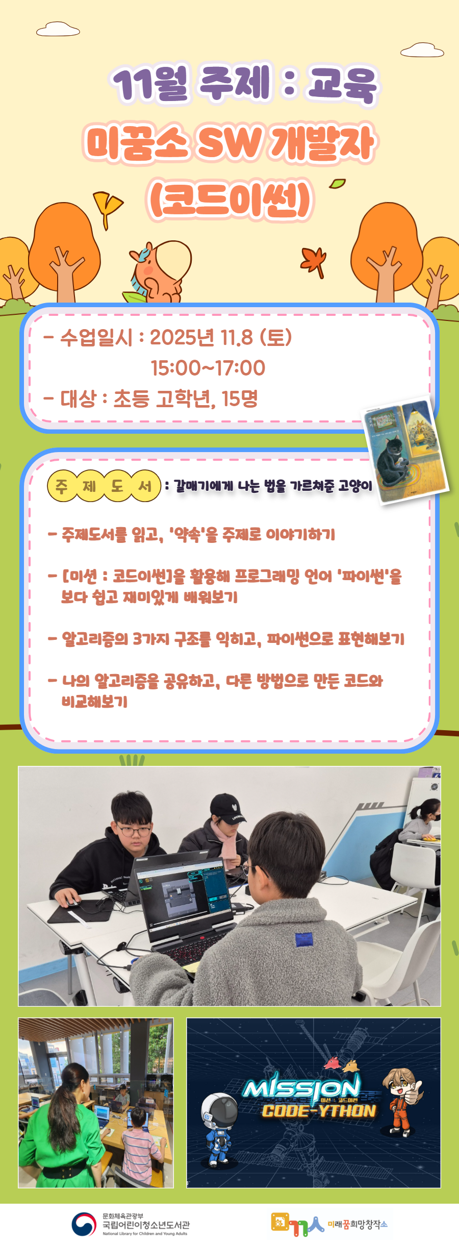 10. 프로그램 참여 모습은 도서관 홍보(비영리목적)를 위해 촬영 및 활용 될 수 있으며, 결과물에 대한 저작권은 국립어린이청소년도서관에 귀속됩니다.