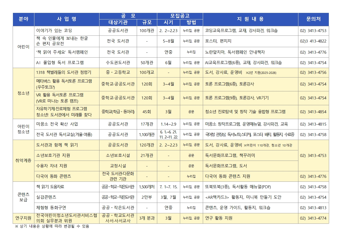 전국 공공・작은・학교 도서관을 대상으로 어린이・청소년 독서문화 확산을 위해 아래와 같이 지원사업을